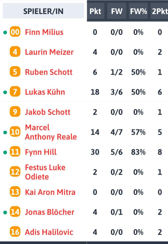 Die restlichen wurden gewonnen. Die Mannschaft hat ausgenutzt, dass der Gegner nur zu acht war und durchgehend gepresst. Das hat das Team nicht wirklich gut gemacht und hat somit einige Fastbreaks kassiert. Sonst wäre es schon früher deutlicher geworden. Es war außerdem gut, dass Adis Halilovic mitgespielt hat, da Heidesheim einen großen schweren 5er hatte und Adis dagegen halten konnte. Wir haben in der Offense nicht so gut gespielt wie letzte Woche, wenig Geduld gehabt und der Ball ist nicht so gut gelaufen. Trotzdem gute Teamleistung und am Ende zählt nur:,, Gewonnen ist gewonnen.“